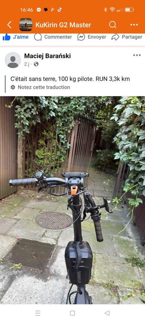 Une première amélioration appréciée des utilisateurs de la G2 Master est l’extension de guidon. En plus de réduire le « guidonnage » ( vibration de gauche à droite) à haute vitesse, l’extension permet aussi d’ajouter 5 cm de chaque côté pour ajouter des accessoires comme des miroirs, support à téléphone ou autre. Ce modèle est disponible sur Aliexpress.com pour environ 15$ CAD.